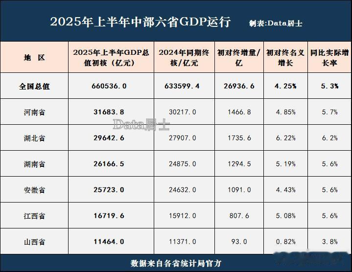 来看下表,雅致了解中部地区本年半年度的GDP获利单: